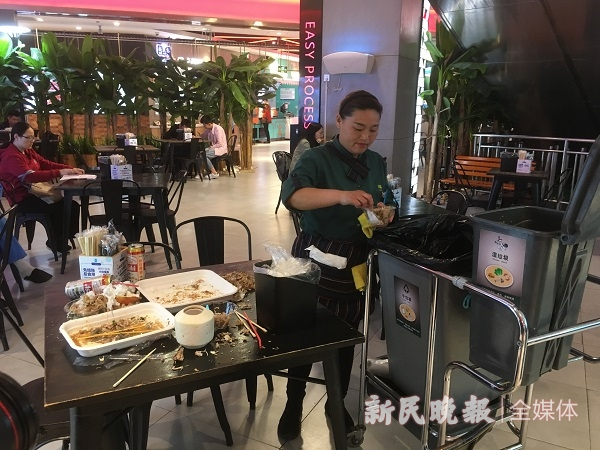 在另一家餐饮店庄隐阁内,除了四分类垃圾桶外,含油脂率较高的餐厨垃圾也区别于湿垃圾单独投放,分类更为细致。员工表示,在商场启动垃圾分类之后,曾因分类不规范而被物业拒收过垃圾,直至按要求分到合格后,垃圾才被收走。