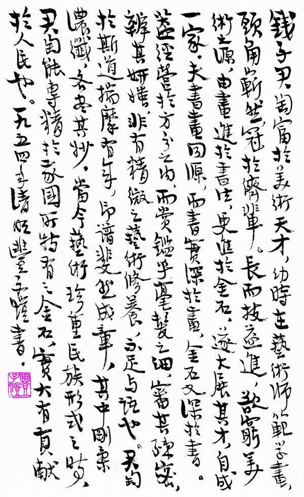 君匋于斯道揣摩有年,印谱斐然成章,其中刚柔浓纤,各尽其妙。当今艺术珍重民族形式之时,君匋能专精于我国所特有之金石,实大有贡献于人民也。”