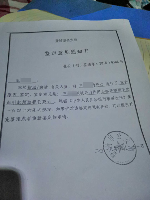 2018年10月21日,登封市公安局对王成的死因进行了鉴定,鉴定结果为:王成系被外力作用头部致硬膜下出血引起颅脑损伤死亡。