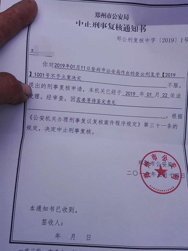 王家佳申请复议,登封市公安局维持原决定。他随后又向上级公安机关申请刑事复核,2019年3月14日,郑州市公安局以需重新鉴定意见为由,决定中止刑事复核。目前案件仍处于中止复核阶段。