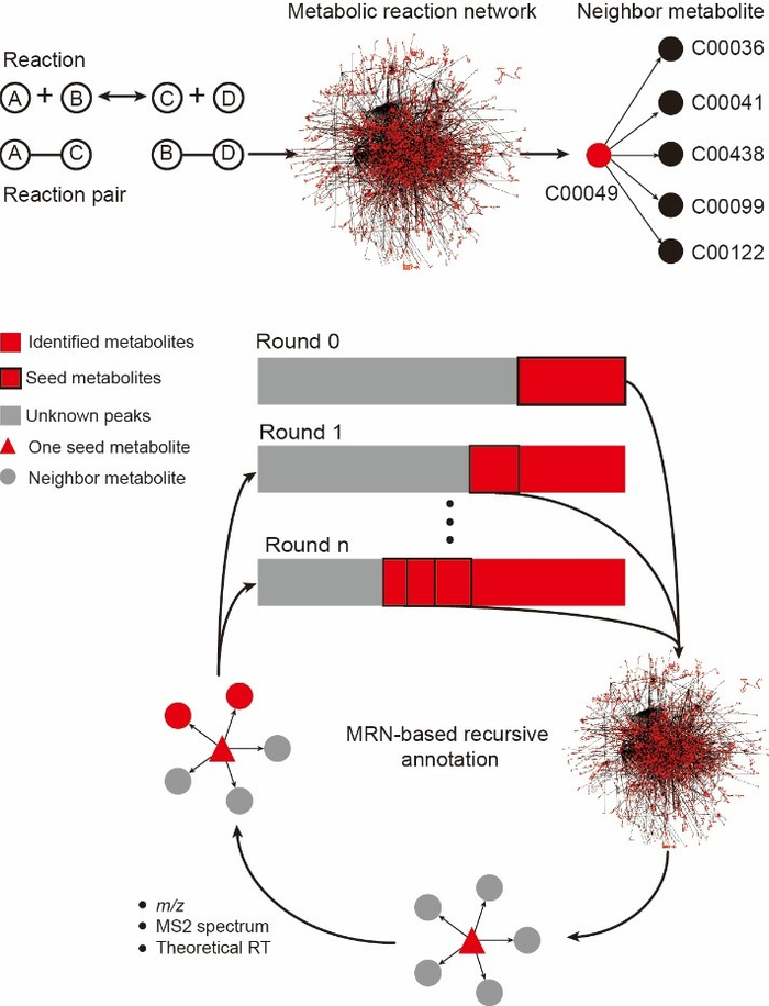 在细胞代谢中,一个代谢物可以通过酶催化反应转变为另一种代谢物。同一个代谢反应中两个代谢物可定义为反应对邻近代谢物(reaction-paired neighbor metabolite)。反应对邻近代谢物具有结构相似性,因此其MS/MS谱图也具有一定的相似性。利用这个原理,MetDNA算法利用样本中已经鉴定出的代谢物作为种子,进一步鉴定代谢网络中邻近的代谢物。新鉴定出的代谢物可作为新的种子,继续鉴定代谢网络中邻近代谢物,递归运算,直到不再能够鉴定出新的邻近代谢物。该算法的最大特点是可以通过代谢反应网络去鉴定没有标准MS/MS谱图的代谢物,使得代谢物的结构鉴定并不依赖很大规模的标准MS/MS数据库。例如,MetDNA方法可以利用20个种子代谢物即可完成>1000个邻近代谢物的注释,创新性地克服了代谢物标准MS/MS谱图库数目的限制。研究人员使用MetDNA处理了多个数据集(涵盖5种物种、7种样品类型以及多种仪器平台),所有的数据集都能鉴定出来约2000个代谢物的结构,证明了MetDNA是一个不依赖于平台且较为通用的代谢物结构鉴定算法和工具。