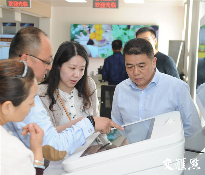 红窑镇工作人员向前来采访的媒体人员和涟水县行政审批局局长陆士国演示自助服务一体机功能