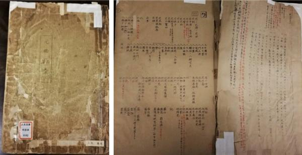 回到先生俗语研究的话题。我在龙云寺发现了题为《元曲语汇》的稿本,是老旧的油印本(俗称蜡版)。虽然说“发现”,但并不是我第一个发现,专家们应该早就知晓此事。根据《凡例》可知,这是将人文科学研究所元曲研究室编制完成的约三万张《元曲选》卡片以注音字母的顺序排列而成,就其基本性质而言,应该认为是词汇集,而不是例句集。不过,先生照例在该稿本上写满了朱墨笔批注。记得我在人文科学研究所当助手的时候,装着《元曲选》卡片的箱子放置在一个大房间里,经常有元曲专家前来调阅。