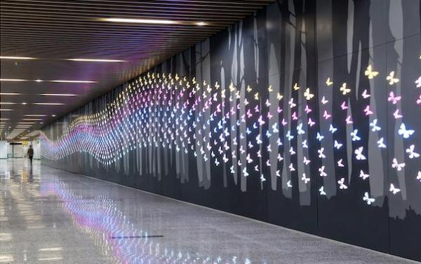 几乎每个匆匆在上海地铁汉中路站是1、12、13号线三线换乘走道通勤的人,都会对一堵布满蝴蝶的墙记忆犹新,这是一个名为《地下蝴蝶魔法森林》的灯光装置作品,缘起于“庄周梦蝶”。这也开启了上海地铁与伦敦国际合作的。