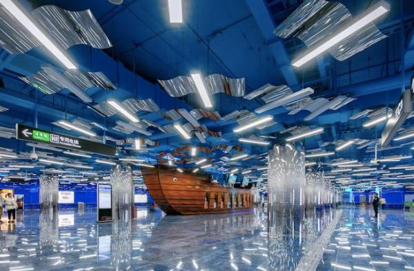 青岛地铁李村站则是引入了“青岛制造”的概念,体现青岛啤酒、海尔、崂山可乐等青岛本土品牌故事,并取材海洋元素突出地理特征。同样,广州地铁南沙客运港站也是全面融入海洋、宝船、海鸥等文化元素进行设计,给乘客带来一场“梦幻旅程”。
