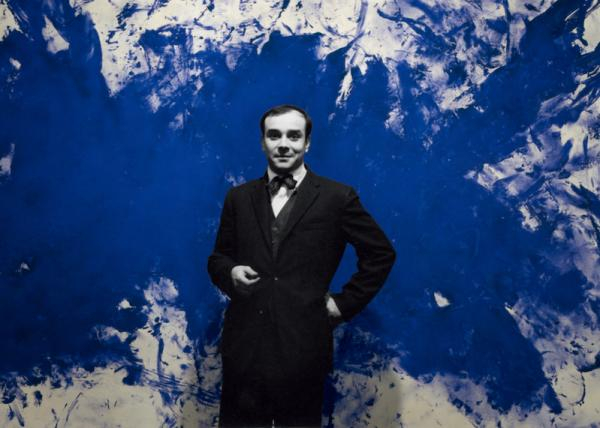 伊夫·克莱因站在其作品《蓝色大幅人体测量学——致敬田纳西·威廉斯》(ANT 76)前,巴黎右岸画廊,法国,1960。图片 ©皮埃尔·德卡尔格, 伊夫·克莱因遗产;平面和造型艺术著作人协会,巴黎,2019。
