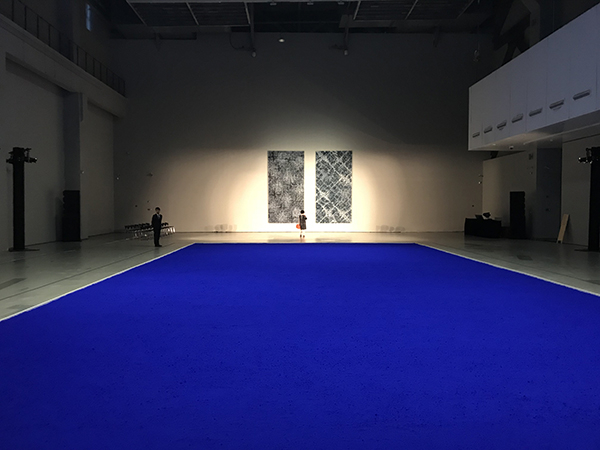 在上海当代艺术博物馆的展览现场,“澎湃新闻·艺术评论”(www.thepaper.cn)看到了贯穿于整个展览之中的“克莱因蓝”。李禹焕的“无尽的阶梯”从展览的一楼延伸至二楼,阶梯的两侧分别铺着白色和克莱因蓝色的石子。沿着台阶来到二楼,可以看到这里的一大片空间都被克莱因的大型作品《蓝色色粉》所占据,从这片泳池一般的蓝色开始,观众将通往克莱因的世界,并领略他与另两位艺术家跨时空的对话。