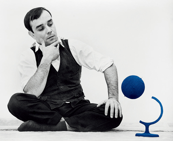 “伊夫·克莱因和《蓝色星球》(星球雕塑7号),巴黎第一孔帕涅街14号,1961年”,照片,30 x 24.4 cm。作品 © 伊夫·克莱因遗产;平面和造型艺术著作人协会,巴黎 / SACK,首尔,2019。原图为黑白两色。图片© 哈里·勋克、亚诺什·肯德 / 让·保罗·盖蒂信托。盖蒂研究中心,洛杉矶。