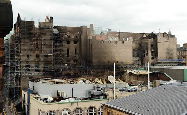 在欧洲,历史建筑损毁后被当作废墟保护的案例,自法国大革命以来比比皆是。二战中被炸毁的德国柏林威廉皇帝纪念教堂(Kaiser-Wilhelm-Gedächtniskirche),在1957年胜出的重建方案中原计划清除废墟,由于民众强烈反对,残断的塔楼得以部分保留并融进现代主义的设计中。更接近当下的例子,要数英国格拉斯哥艺术学院(Glasgow School of Art)。这座建于19世纪末的建筑是麦金托什(Charles Rennie Mackintosh)新艺术运动的代表作,2014年失火,在耗资甚巨的修复工程即将验收之际,因施工管理不善,于2018年6月15日再次焚毁。两次被火烧,残存的墙壁因坍塌危险不得不被拆除,重新修复所需的费用已成天文数字……这座历史建筑是否还具有恢复的意义,相关各界至今仍在讨论之中。