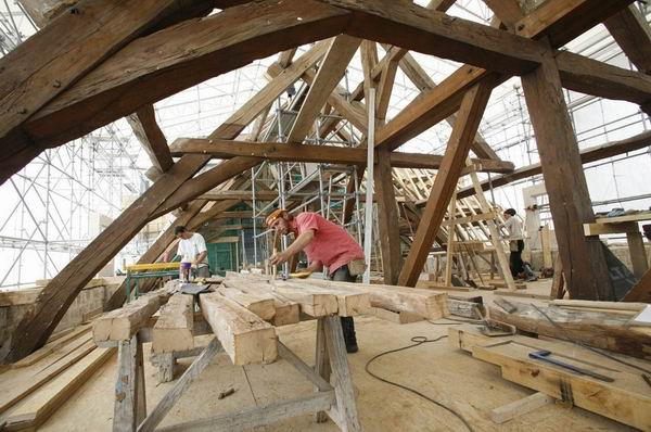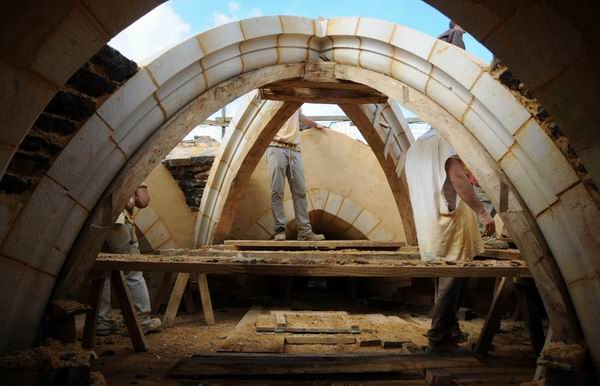 由于仍具备活态的传统技艺和工匠行会体系,法国也是西欧国家中特别善于采用原材料、原工艺修缮、乃至复建历史建筑的国家。正在进行中的贵德隆城堡(Château de Guédelon)建造计划,堪称是世界最大的实验考古学项目。从1997年破土平整地基开始,建造工程不仅按照12、13世纪的城堡设计范式开展,而且力求在每一个细节严格采用中世纪的技术与材料,甚至连工人服饰都认真还原。除此以外,各个行会还广泛参与文物古迹的修缮。小到未达登录级别的历史建筑,大到世界遗产地的修缮,都可以见到传统匠师的身影。比如建于17世纪的贝桑松堡垒(Citadelle de Besançon),在2008年被列入世界遗产地,其历史建筑的木构屋顶复原修缮,就是由行会主导的。