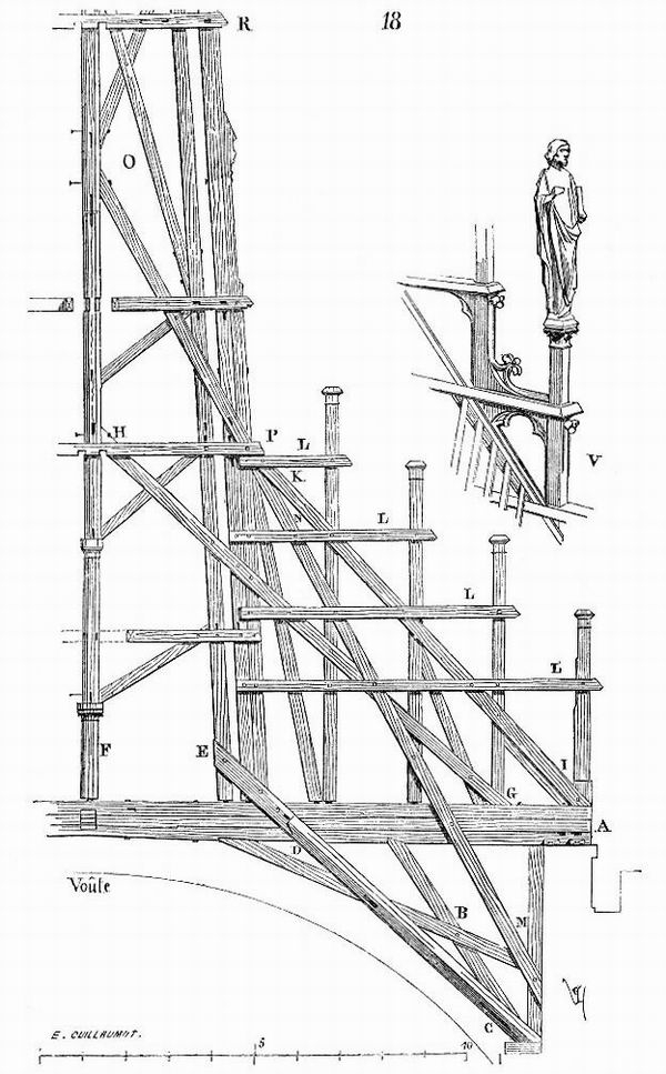 这次在大火中崩塌的巴黎圣母院尖塔,虽为维奥莱-勒-杜克所设计,但他并未采用自己在其他项目中常用的铸铁结构,一个重要的原因正是建造行会的加入。基于对圣母院之特殊性的认识,以及行会建造能力的了解,他特别设计了一个加高加大的纯木质尖塔,以期与建筑的整体气质相符,并由当时行会最优秀的匠师们依照“古法”施工完成。维奥莱-勒-杜克本人不仅熟稔哥特风格的设计原则,同时也对结构工程着迷。1860年,尖塔刚刚竣工就接受了罕见风暴的考验,作为当时巴黎最高建筑的它丝毫未损,堪称结构设计与传统施工的杰作。