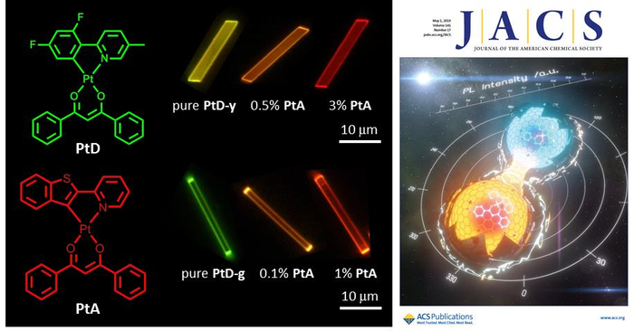 在国家自然科学基金委和中国科学院先导项目支持下,中科院化学研究所光化学重点实验室光功能材料与光电化学研究团队近年来利用金属有机化合物的分子可设计性和强组装能力,合成了一系列刺激响应光功能分子材料和薄膜(J. Am. Chem. Soc. 2018, 140, 12337-12340;J. Am. Chem. Soc. 2018, 140, 7723-7729);并率先制备金属有机化合物的高规整度二元微纳晶体,实现基于高效捕光能量转移的三线态可调发光(J. Am. Chem. Soc. 2018, 140, 4269-4278;Angew. Chem. Int. Ed. 2018, 57, 7820-7825)。