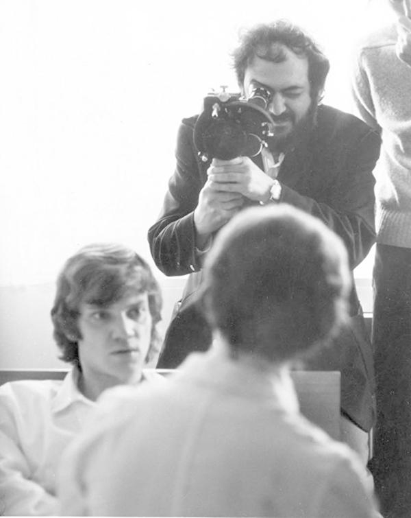 导演库布里克(后持摄影机者)与马尔科姆·麦克道威尔(左)在电影《发条橙》片场