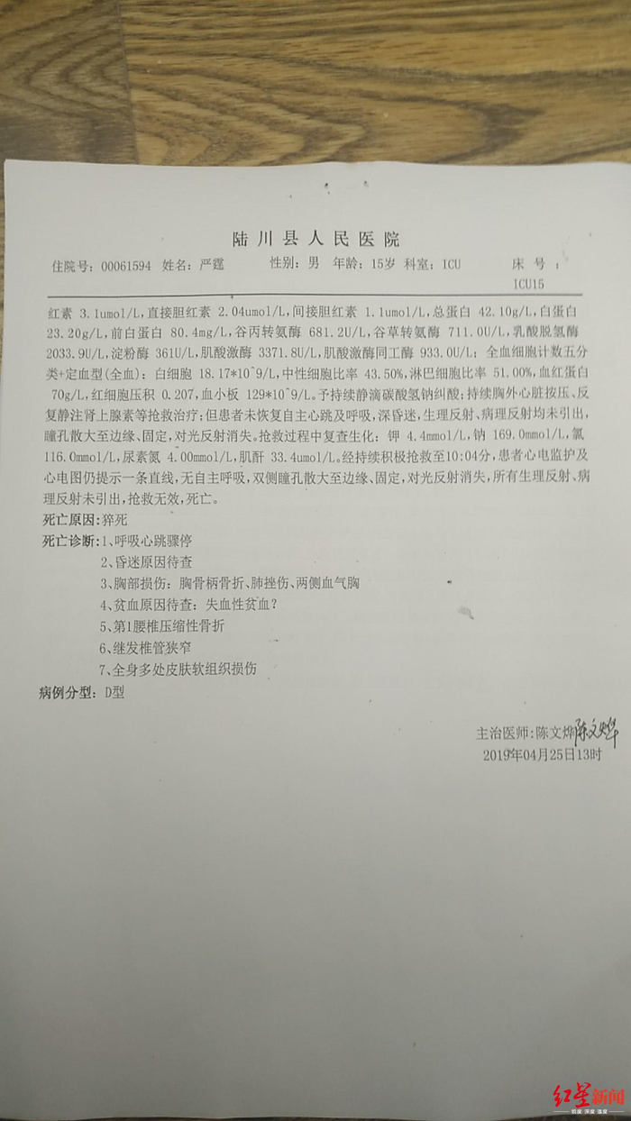 记录中还记载,严霆死亡诊断为“呼吸心跳骤停;昏迷原因待查;胸部损伤:胸骨柄骨折、肺挫伤、两侧血气胸;贫血原因待查;失血性贫血;第1腰椎压缩性骨折;继发椎管狭窄;全身多处皮肤软组织损伤。”死亡原因:猝死。
