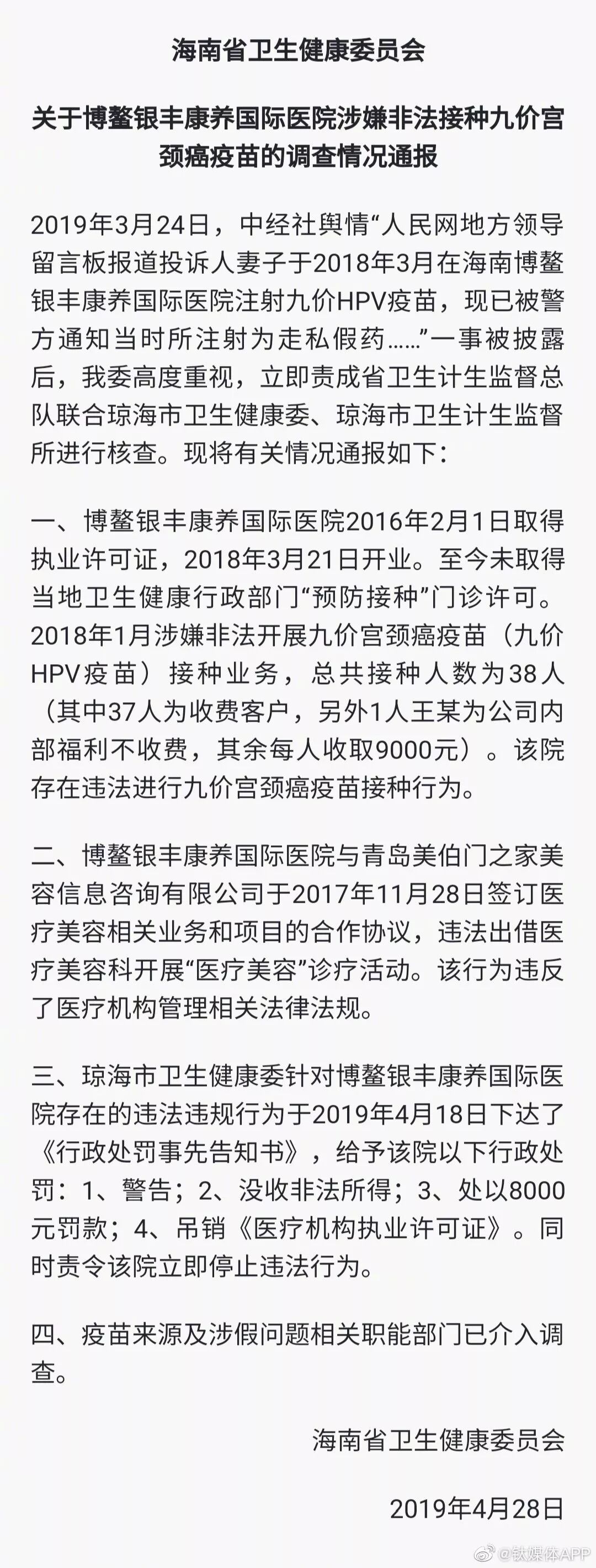 4月28日,海南省卫生健康委员会通报博鳌银丰康养国际医院涉嫌非法接种九价宫颈癌疫苗的调查结果,明确该院存在违法进行九价宫颈癌疫苗接种行为。