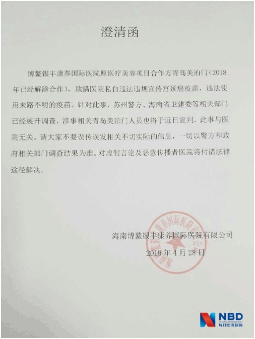 据《每日经济新闻》报道,一名受害人表示,银丰康养医院给他们发来一份澄清函,称原医疗美容项目合作方青岛美泊门(2018年已经解除合作关系),欺瞒医院私自违法违规宣传宫颈癌疫苗,违法使用来路不明的疫苗。