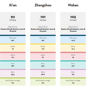 将卡迪夫与中国的三个城市——西安(92)、郑州(101)和武汉(103)进行比较可以发现,这些城市在人才培养和留住人才方面没有太大差异(武汉除外),关键区别在于吸引和激发人才。