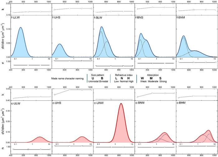 基于观测网长期分布式观测获得的1万余条第一手观测资料,通过亚模态大气气溶胶特性遥感反演方法(doi: 10.5194/amt-10-3203-2017)拆解粒子谱分布函数,获得分模态的体积尺度谱和复折射指数两类参数,建立了代表性的气候学原始数据集。