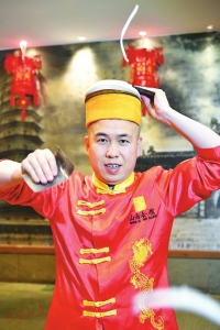 “他吹的最大的面气球,直径有1.8米,创了吉尼斯世界纪录。”一位曾欣赏过王张龙表演的食客,说起这位面食大师的拿手绝活啧啧称赞。其实,王张龙还是16384根龙须面的吉尼斯世界纪录保持者,这个37岁的“面食超人”,几乎拿遍了所有面食大赛的奖项。