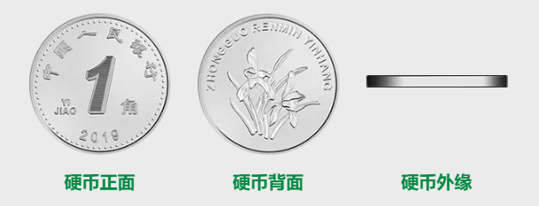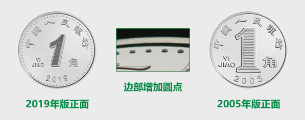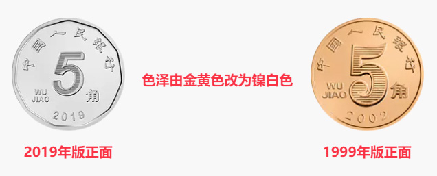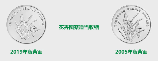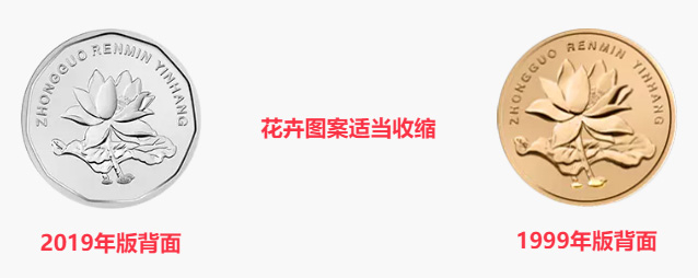与1999年版第五套人民币1元、5角硬币和2005年版第五套人民币1角硬币相比,2019年版第五套人民币1元、5角、1角硬币调整了正面面额数字的造型,背面花卉图案适当收缩。