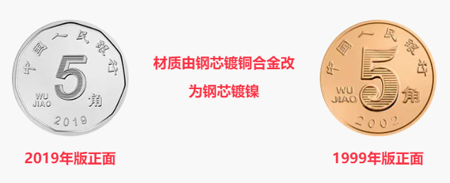 材质由钢芯镀铜合金改为钢芯镀镍,色泽由金黄色改为镍白色。正背面内周缘由圆形调整为多边形。