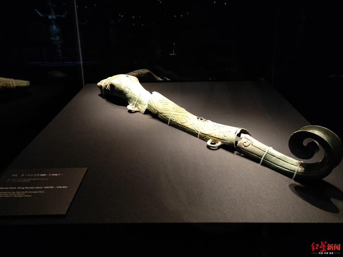 蛇的身影不仅在中华文明中居于重要地位,它更贯穿于中国西南巴蜀地区的早期文明之中。展览展出的两件古蜀时期的蛇形文物,讲述了蛇是如何与“神”结合在一起的。在距今5000-3000年的四川广汉三星堆遗址,曾出土了一条古蜀国用于祭祀的铜蛇,铜蛇的身体上刻画着云纹、鳞甲、羽翅,似乎立刻就要腾空飞起。另一件从成都金沙遗址出土的石蛇则盘绕于地,蛇首以黑色、朱色颜料绘出眼眶、瞳孔等特征,与众多祭祀用品一并埋在祭祀区。