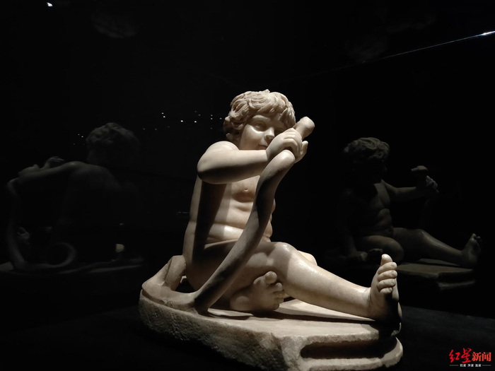 据讲解员介绍,古罗马人将两条交缠的蛇构成的图案视作珍贵的幸运符,装饰于手镯、戒指之上。这个图案叫做“赫拉克勒斯之结”,它源于希腊神话中年幼的大力神赫拉克勒斯徒手对抗雅典娜派来的群蛇的故事。一尊公元2世纪的雕像生动呈现了这个令人震撼的场景,也展示出了蛇在古希腊和古罗马神话中所具备的矛盾含义:威胁和保护。