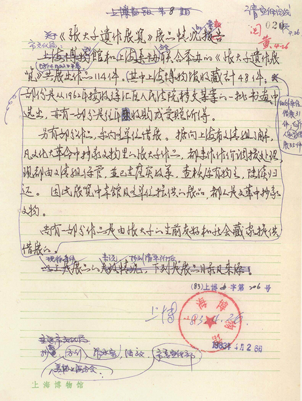 1983年4月26日,上海博物馆提交的《关于“张大千遗作展览”展品情况的报告》。