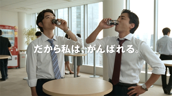 最近的GEORGIA罐装咖啡广告中,演员山田孝之(右)和染谷将太扮演的上班族在工间喝咖啡小憩。广告文案意为:“正因为如此(工作有意义),我才能奋斗下去!” 图片来自:Georgia.jp