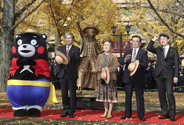 为了表彰尾田荣一郎的义举,熊本县政府为“路飞”建造了一座雕像。2018年11月,“路飞”雕像在熊本县政府门前落成。熊本县知事蒲岛郁夫(左二)、熊本县吉祥物酷MA萌(左一)等手持象征“路飞”的草帽,出席了揭幕仪式。图片来自:产经新闻