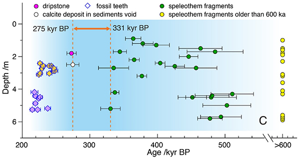 2013年以来,该研究团队对位于安徽省东至县的华龙洞进行了连续5年的系统发掘,先后发现了30余件古人类化石、100余件古人类制作使用的石器、40余种哺乳动物化石。此外,还发现了动物骨骼表面切割、砍砸痕迹等反映古人类生存行为的多种证据。通过同位素测年、动物群组成分析及地层对比等多种方法的综合研究,人类化石的年代被确定为距今33.1万-27.5万年之间。