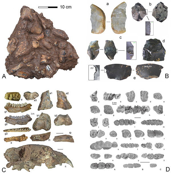 图4 华龙洞遗址动物化石堆积情况(A),出土的石制品(B)及哺乳动物化石(C,D)(同号文、李强、裴树文供图)