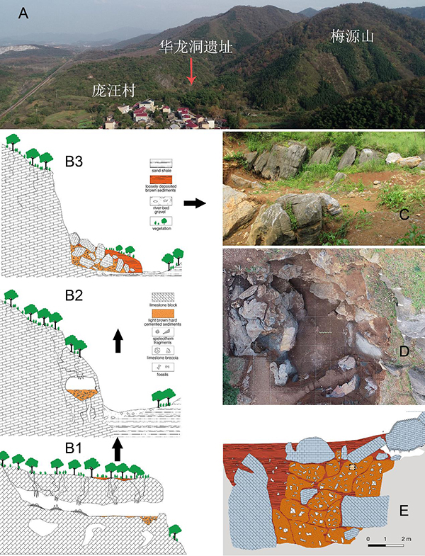 图2 华龙洞遗址及其化石分布情况。A 华龙洞周边地貌特征;B1-B3: 遗址形成过程模式图;C:2014年华龙洞发掘前景象;D:2016年华龙洞遗址发掘后空中俯视图;E:出土人类头骨化石点遗址纵向切面模式图(蔡演军、裴树文供图)