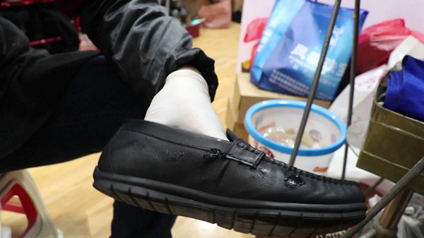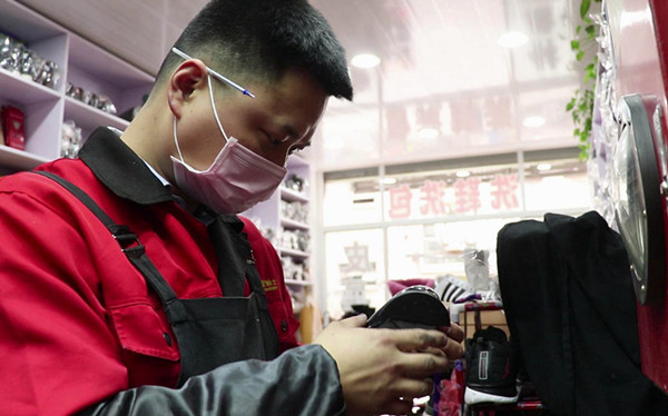 正说着一位老顾客上门取鞋了:“我一直都在这边修鞋、洗鞋,这双鞋子之前已经不能穿了,上面全是污渍、色斑,真想把它扔到垃圾桶里面去。但想想这双鞋子不应该扔,因为我买的时候还挺贵的,现在鞋子洗得很干净,就像新买的一样。”