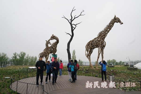图说:植物园楼顶摆放着长颈鹿雕塑,长颈鹿高达十米