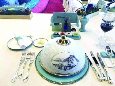 以“富春山居图”作为器物开窗图案、八角顶的尊顶盖、餐瓷上饰以宝相花和通草纹组成的图案……“丝路国宴”整套餐瓷共66件,融合了古代隋唐时期的元素以及陆上丝绸之路和海上丝绸之路的概念。主创设计师杨珍介绍,传统纹样“吉祥三宝”之一的“宝相花”,表达了吉祥、美满的寓意,辅助图案为“唐草纹”和“海浪纹”,传达了陆上、海上丝绸之路的概念;器型显著位置选用的“富春山居图”,则展现了中国传统的山水艺术文化。