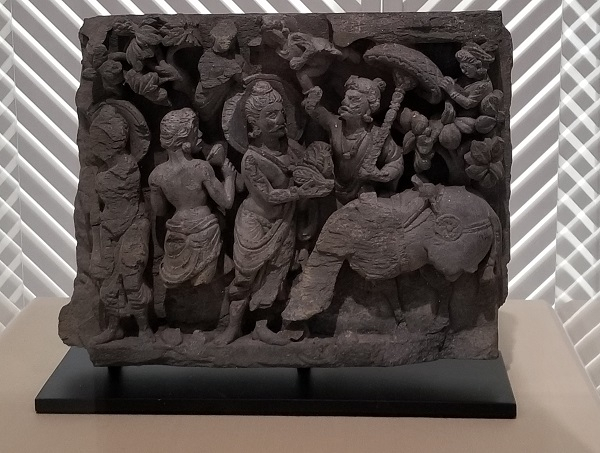 此作所展现的场景是释迦太子骑马离开迦毗罗卫之后,行到阿奴摩国,下马将身上的宝衣、缨络、宝冠解下,尽数给了 马夫车匿。画面中最令人动容的是释迦太子的坐骑犍陟马:“屈膝而舐足,长息泪流连”,而车匿“悲塞情昏迷,合掌而 胡跪”。与白马告别是佛陀走向修行之路感动人心的一幕,使得这一主题在犍陀罗浮雕中成为热门的描述对象。