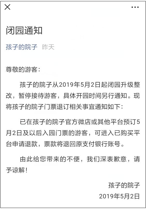5月2日凌晨,记者从“孩子的院子”微信公众号看到,该公众号已发布闭园通知称,从2019年5月2日起闭园升级整改,暂停接待游客,具体开园时间另行通知。