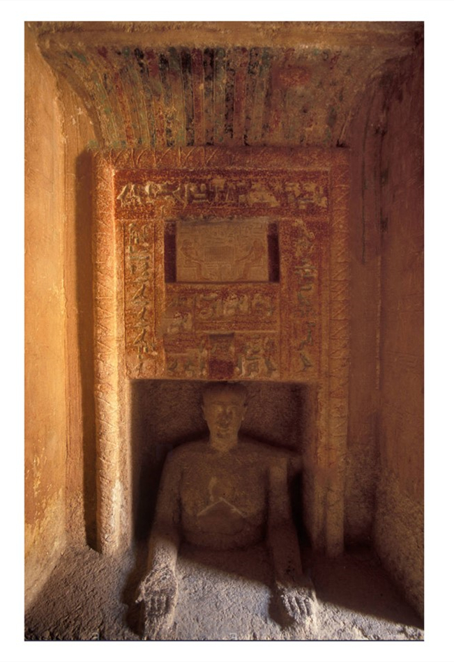 贝恩斯教授首先展示了古埃及墓葬中极富特色的假门(false door),假门即雕刻或描绘在墓室或神庙墙壁上的门形图像,是一种常见的古埃及墓葬装饰。假门往往与周围的壁画、浮雕、雕像等墓葬装饰元素组合在一起,共同营造举行供奉仪式的神圣空间。古埃及人认为,墓主人可以从假门走出来接受供奉。贝恩斯教授展示了一件特别的假门,在假门的下半部浮现出墓主Idu立体的躯干,栩栩如生的墓主的雕像作伸出双手状,似乎是在欢迎来者,假门的前方有用来放置供品的供奉桌,供奉桌的形状也具有象征性,即古埃及象形文字中表示供奉桌(offering slab)的符号。