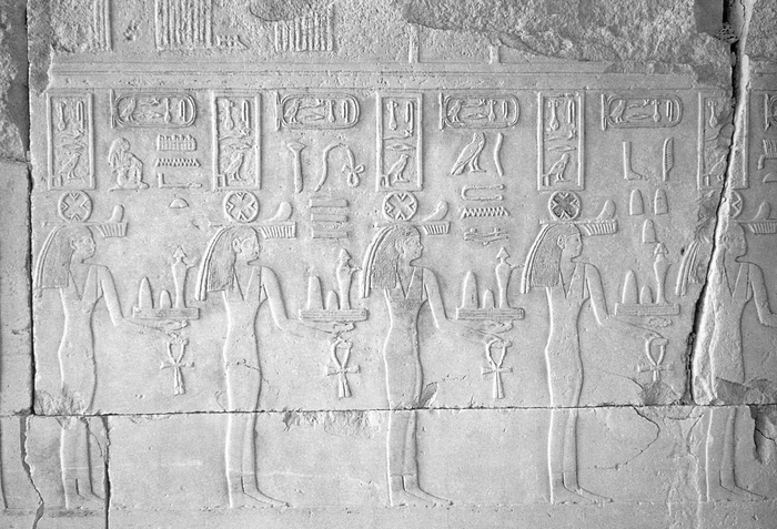 此外,贝恩斯教授指出,在古埃及艺术中,并非所有的人物形象都表现了真正的“人”,也可能是对某些物象的拟人化表现。第四王朝国王斯奈夫鲁(Snofru)的河谷神庙浮雕中,有一些手捧供品的女神形象,她们是国王斯奈夫鲁所拥有土地(estates)的化身,从一些细节中可以窥见其中的奥秘:她们头戴象征城市的象形文字符号头冠,女神上方刻有铭文,可能是“她们”所代表地区的名称。
