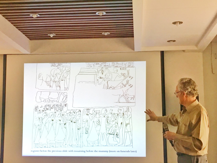 贝恩斯教授指出,古埃及还有一种特殊的群体表演,即葬礼上的哀悼表演,表演者一般是职业的女子哭丧队。从墓室壁画中的送葬场景可见,这些哭丧队女子有“标准化”的着装和哭丧方式。她们身着亚麻长裙,裸露出胸部,她们姿势各异,有的捶胸顿足,撕扯头发和衣物,有跪地掩面嚎哭,并抓起地上的泥土抹在头顶和脸上,以示哀恸,俨然是一出经过排练的大型表演。值得注意的是,在一些高等级官员的送葬队列中,哀悼者为男性,但哭丧方式大同小异。此外,贝恩斯教授还列举了其他考古材料,如墓葬中出土的各种仪式用品,运送雕像、木乃伊和棺木的场景,以及宰杀祭祀所用的牲畜等场景的壁画或浮雕。这些物质与图像资料,使听众得以大致了解古埃及丧葬仪式和祭品供应的基本情况。