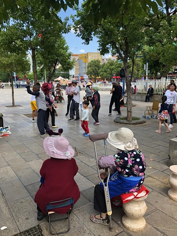 与呈贡新区空荡荡的广场和公园相比,呈贡县城的文化广场上呈现出丰富的活动。广场一角的树池下是各种算命摊位,一棵树下坐一个中老年妇女,面前摆一个签筒;另一角的树池下都是推拿按摩的摊位,摊主多为中青年妇女;而广场另一边的树池下,一半是聊天休息的地方,一半则成了广场舞的地盘,男女老少皆有,舞姿即兴而妖娆。