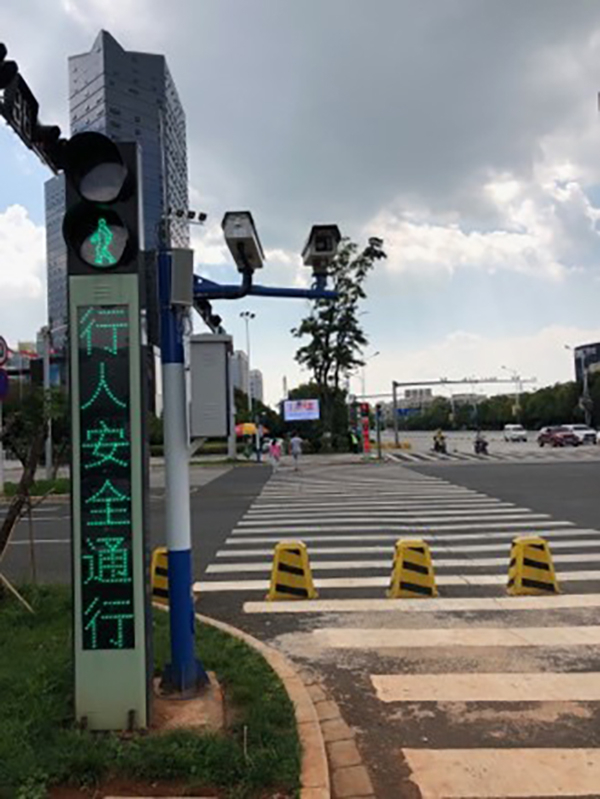 彩云路上的十字路口,行人一次无法通过,要在路中央等待二次过街
