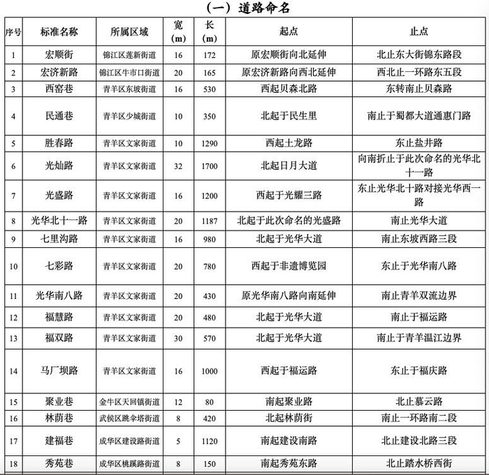 22条命名道路中,青羊区12条,成华区5条,锦江区2条,金牛区1条,武侯区1条,高新区1条。其中,青羊区文家街道是此次命名道路最多的区域,道路命名数量达到10条。
