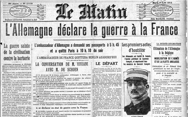 1914年8月4日,星期二。街道上,咖啡馆里,地铁中,巴黎市民们拿着当天的早报,谈论着同一个话题:战争。