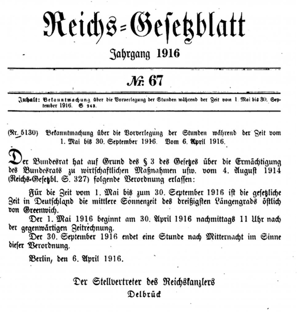 1916年4月6日从柏林的德意志帝国联邦议会发出的法令。盟国奥匈帝国也在同一时间宣布与德国一同进入夏令时