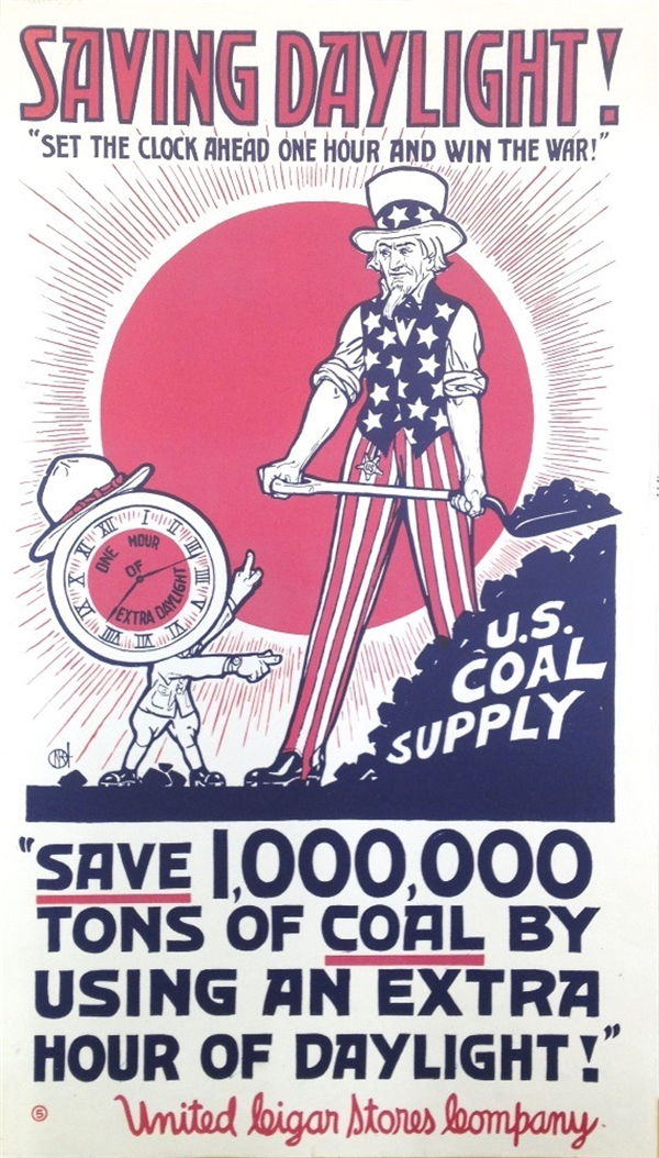 美国参战后,国内支持设立夏令时的宣传海报。上方的大标题写着“保存日光!将时钟拨快一个小时来赢得战争!”下方则着重介绍夏令时的经济效益“通过享受多一个小时的日光来节约一百万吨煤炭!”时间和煤炭一样,都成为了为战争服务的资源