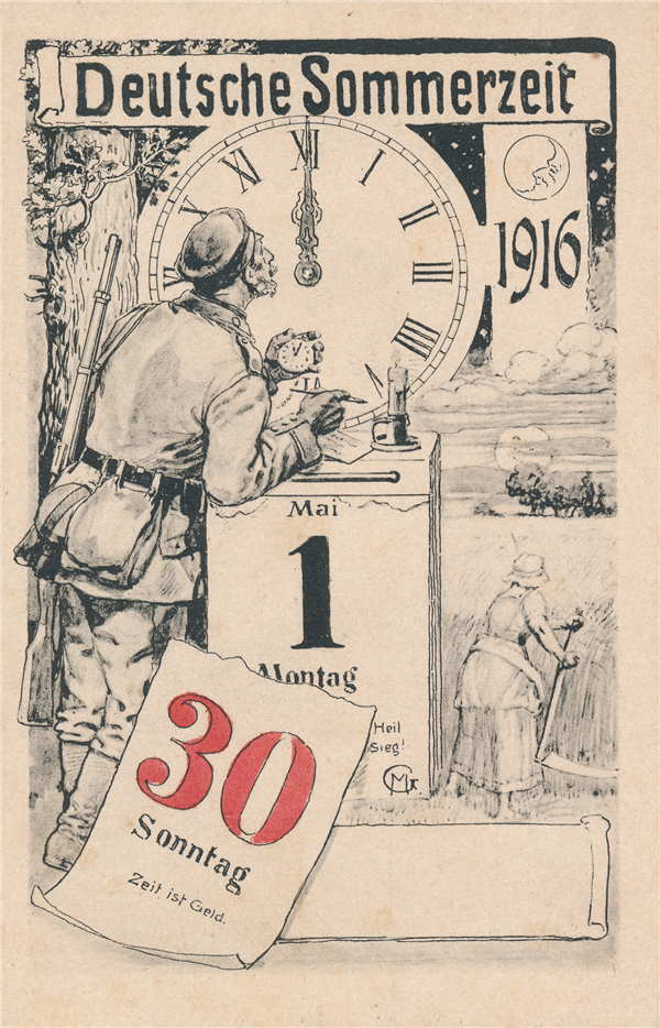 之后的故事我们大家都很熟悉了,所有人都认为可以迅速结束的战争越拖越长。圣诞节过去了,复活节过去了,战争丝毫没有任何要结束的意思。此时战争已经从单纯军事力量的比拼发展成了对参战各国攫取及调配资源能力和效率的考验。作为人类历史上第一场总体战,战争对日常生活的入侵和蚕食已经初现端倪。煤炭、食品、电力等等资源都优先向战场倾斜,终于到了1916年,本身在资源储备上处于劣势的德国和奥匈帝国将自己的触手伸向了时间——这一人们新近驯服的资源。