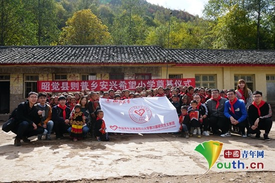 四川大学研支团成员与孩子们在安兴希望小学新建教学楼奠基仪式上合影。四川大学研支团 供图