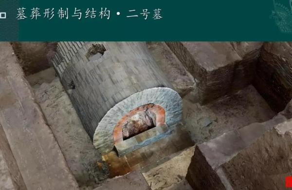 二号墓位于M1南侧,由斜坡墓道、长方形墓室和墓道两侧4个耳室组成。墓道内填土为平头小圆夯平层夯筑。墓室竖穴土坑结构,平面近方形。砖椁位于墓室中部,长方形砖券结构,东、西两侧有三层砖封门。砖券亦分为内外两层,由模制楔形砖砌成,内圈变涂朱砂。出土有铁剑、铜镜、玉鼻塞、肛塞、铜钱、剑格、铁棺钉等文物。